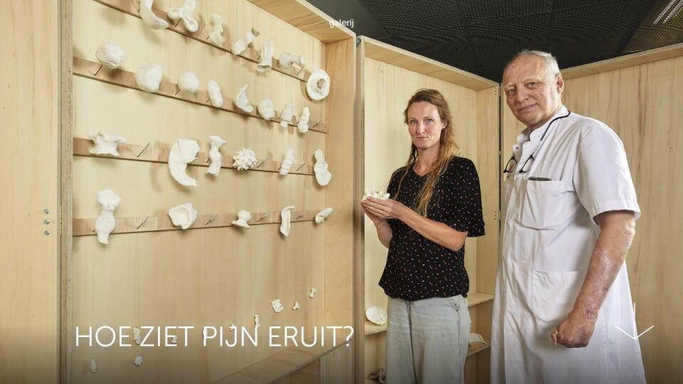 Welke vorm heeft pijn, welke kleur, welke temperatuur – de vragen die Koek stelt komen doorgaans niet aan bod in gesprekken met pijnspecialisten. De komende maanden dus wel. Anesthesioloog en pijnspecialist Frank Wille schuift aan bij ons gesprek, want met hem heeft ze dit project op poten gezet. Hij behandelt mensen met chronische pijnklachten. De komende maanden kunnen zij zich bij Koek aanmelden, waarna ze met hun geboetseerde vorm bij hem op consult komen. En ja, dat kan helpen, denkt Wille: “Als iemand een pijnscore van acht heeft, dan zegt dat eigenlijk niets. Er is een behoefte in de medische wereld aan het zichtbaar kunnen maken van pijn. Als dit een manier blijkt te zijn om dat vorm te geven, dan heb je iets te pakken.”