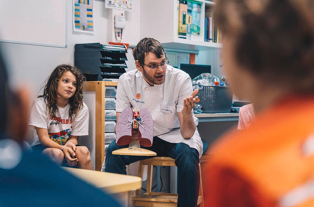 Veel kinderen hebben vragen over roken en vapen. Vrijwilligers van de afdeling Longgeneeskunde en van het Emma Kinderziekenhuis gaven een serie gastlessen in groepen 7 en 8 van basisschool De Biënkorf in Amsterdam-Noord, waar onder meer die vragen aan de orde kwamen. De leerlingen kregen ook uitleg over hoe de longen werken. Onderzoeker Arjen Pelgröm: “Met een fles, ballonnen en rietjes knutselen ze een model in elkaar dat de werking van de longen simuleert. Daarmee kunnen ze ook thuis laten zien wat ze geleerd hebben.” Het scholenproject maakt deel uit van een wereldwijde campagne Healthy Lungs for Life (HLFL) om mensen bewust te maken van het belang van longgezondheid. Kinderen zijn een belangrijke doelgroep.