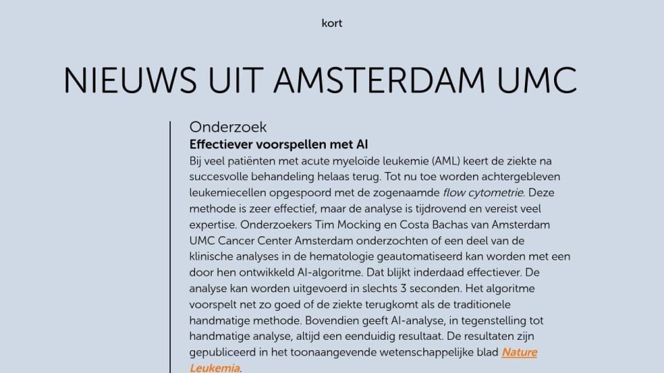Bij veel patiënten met acute myeloïde leukemie (AML) keert de ziekte na succesvolle behandeling helaas terug. Tot nu toe worden achtergebleven leukemiecellen opgespoord met de zogenaamde flow cytometrie. Deze methode is zeer effectief, maar de analyse is tijdrovend en vereist veel expertise. Onderzoekers Tim Mocking en Costa Bachas van Amsterdam UMC Cancer Center Amsterdam onderzochten of een deel van de klinische analyses in de hematologie geautomatiseerd kan worden met een door hen ontwikkeld AI-algoritme. Dat blijkt inderdaad effectiever. De analyse kan worden uitgevoerd in slechts 3 seconden. Het algoritme voorspelt net zo goed of de ziekte terugkomt als de traditionele handmatige methode. Bovendien geeft AI-analyse, in tegenstelling tot handmatige analyse, altijd een eenduidig resultaat. De resultaten zijn gepubliceerd in het toonaangevende wetenschappelijke blad Nature Leukemia.