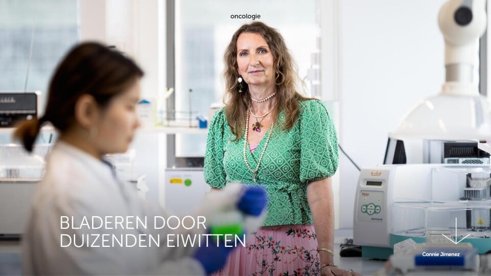 Jimenez kijkt stiekem zelfs al voorbij de tumortherapie. “Ik hoop het vóór mijn pensioen nog mee te maken dat we aan de hand van een druppel bloed deze analyse van eiwitten ook kunnen inzetten als hulp in de preventie van ziekte. We weten dat leefstijl een groot verschil kan maken in het optreden van gezondheidsproblemen. Maar waarom wordt de ene persoon wel te dik, terwijl een ander met hetzelfde dieet keurig op gewicht blijft? Ook daar kunnen we volgens mij met steeds grotere eiwitbibliotheken en steeds krachtiger analyses het verschil gaan maken.” •
