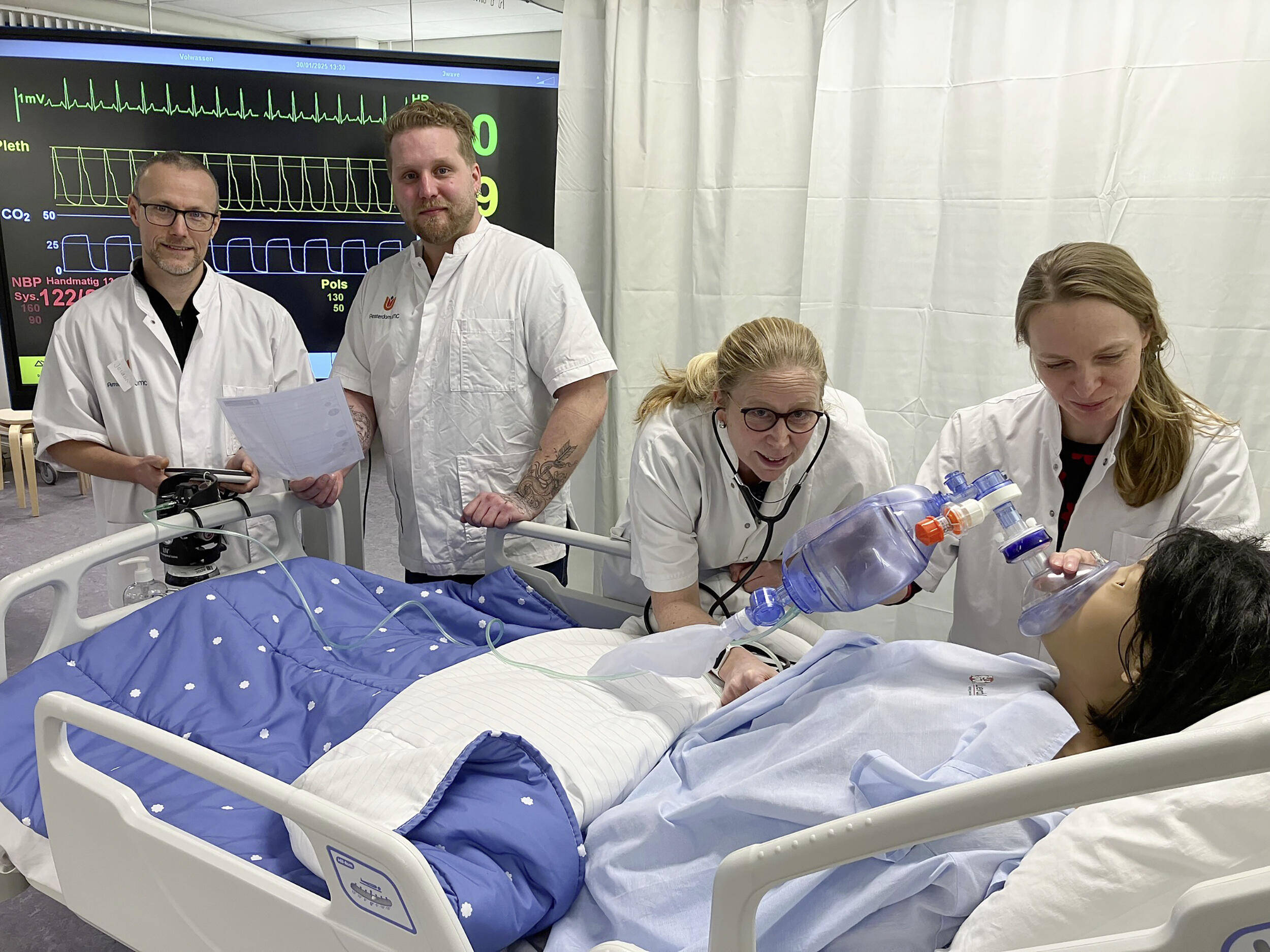 Binnen dat simulatieonderwijs wordt gebruik-gemaakt van zeer geavanceerde poppen, legt projectleider Daphne Vogel uit. Zij is senior onderzoeker voor zorgonderwijs bij Hogeschool Inholland, gepromoveerd arts en onderwijskundige. “Deze levensechte poppen kunnen ademhalen en met de ogen knipperen, ze hebben een hartslag en bloeddruk en ze kunnen – aangestuurd door de docent – ook spreken. Je kunt ze vooraf programmeren met een ziektebeeld. Stel dat je kiest voor een hartinfarct, dan kun je leren reanimeren. Binnen het onderwijs worden deze dure natuurgetrouwe poppen nauwelijks gebruikt. Wij hebben docenten getraind om ze in te zetten in een lesprogramma. Het is een ander soort les die andere vaardigheden van hen vereist.”