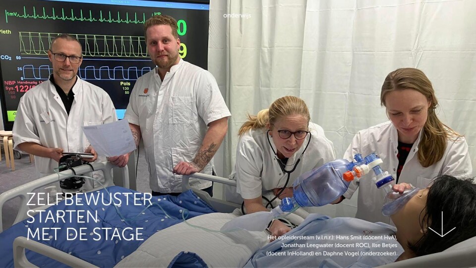 Om studenten verpleegkunde beter voor te bereiden op hun stage, hebben enkele onderwijsinstellingen in Noord-Holland samen met de zorgpraktijk simulatieonderwijs ontwikkeld. Bijzonder is de inzet van zeer geavanceerde simulatiepoppen. Uit een kleinschalig onderzoek blijkt dat deze interactieve aanpak studenten gemotiveerder maakt en meer zelfvertrouwen geeft.