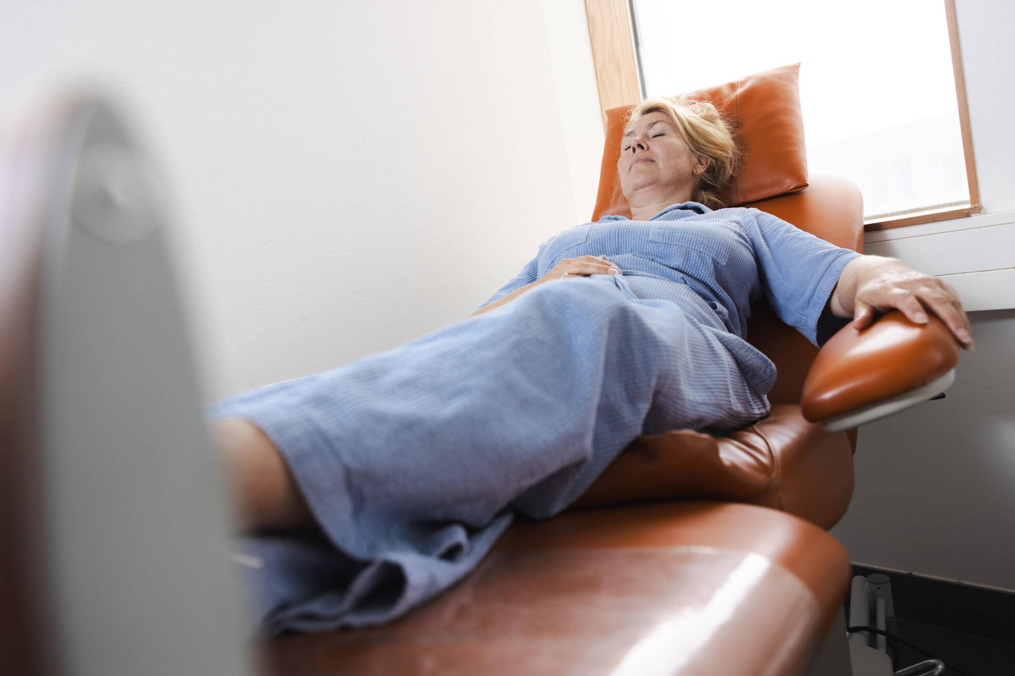 In de wachtkamer staat een ligstoel zodat de patiënten tussen de onderzoeken door kunnen rusten.
