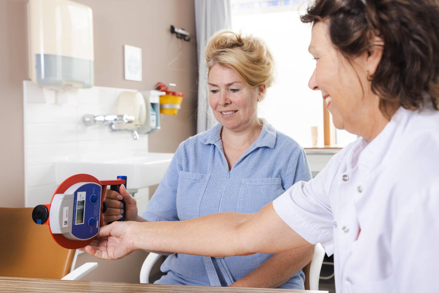 De patiënt krijgt allerlei onderzoeken, zoals een knijpkrachttest (foto boven),