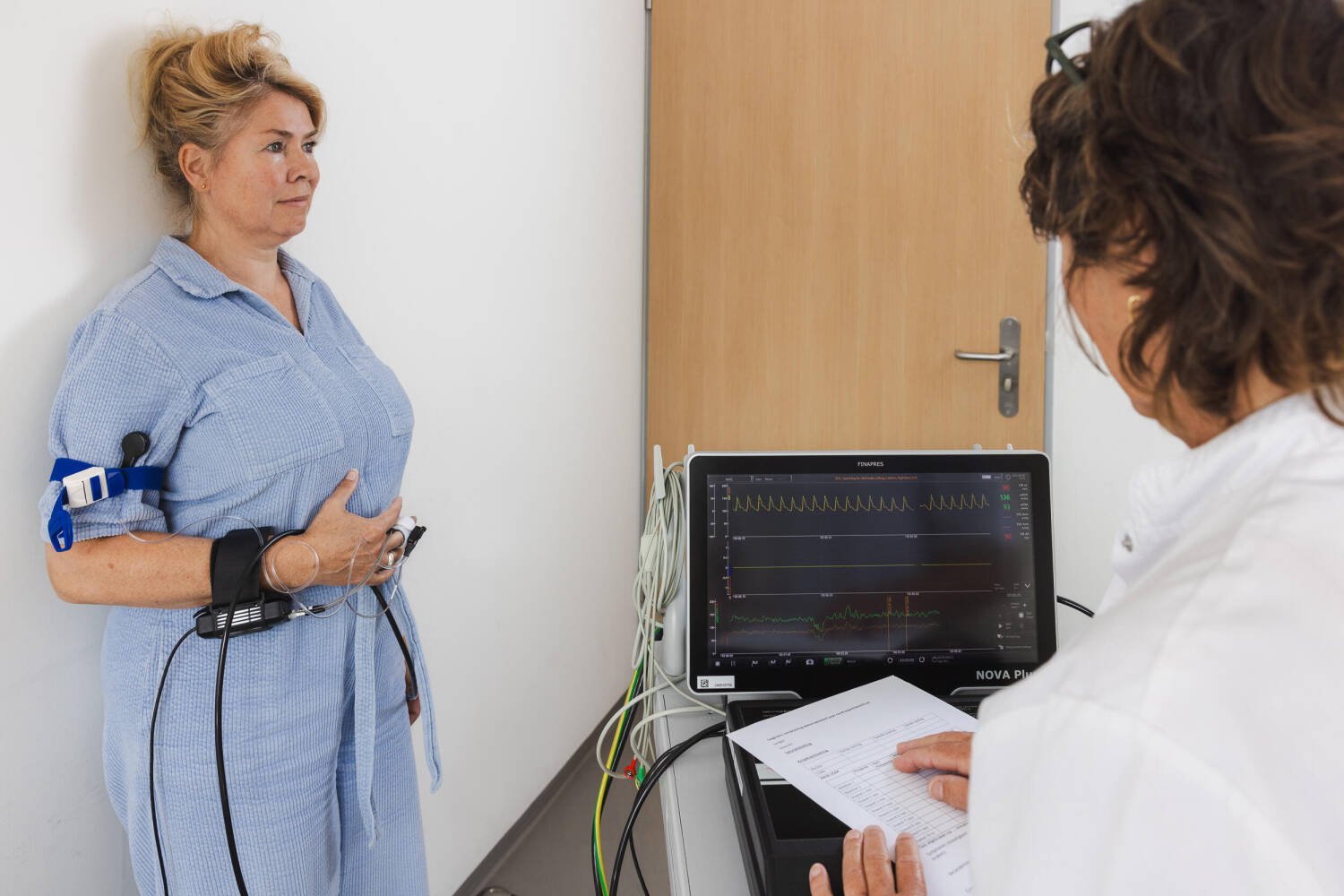 De patiënt krijgt allerlei onderzoeken, zoals een knijpkrachttest (foto boven), de NASA-lean-test (foto hieronder) en bloedonderzoek.