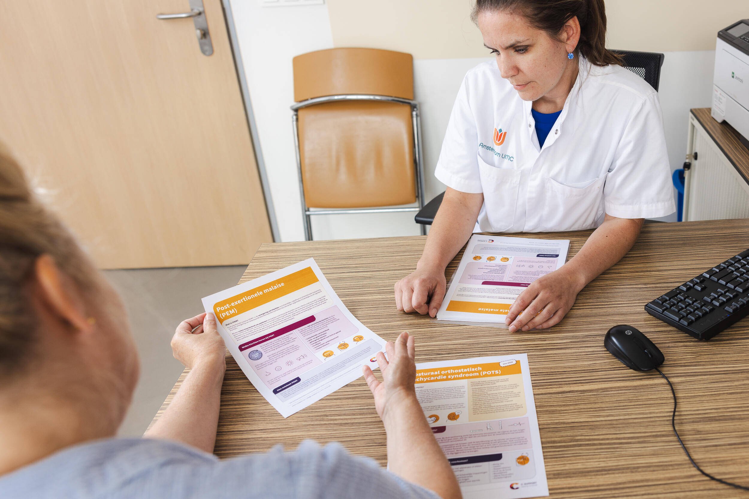 De ingelote patiënten krijgen vragenlijsten toegestuurd. Daarna wordt een lang eenmalig consult op de poli ingepland. Daar wordt eerst de verdere anamnese gedaan. Zo is ook van belang te bespreken welke zorg en hulp er tot dan toe al zijn ingezet. Dan volgen lichamelijk onderzoek en een knijpkrachttest, waarbij de patiënt met één hand in een apparaat knijpt. Van Straaten: “Zo kunnen we een inschatting maken van iemands kracht zonder de patiënt overmatig uit te putten.” Om vast te stellen of sprake is van POTS, wordt de NASA-lean-test gedaan: de patiënt ligt vijf tot tien minuten en gaat dan staan, waarbij het effect op de hartslag en bloeddruk wordt gemeten. “Daarnaast letten we op veranderingen, bijvoorbeeld van de huid. Er zijn patiënten die blauw worden aan handen en voeten.” Bij de kinderen worden ook een neurologisch onderzoek gedaan, een hartfilmpje gemaakt en een longtest gedaan. Daarna gaan de patiënten naar het lab voor een urinemonster en bloedafname. Vervolgens bespreekt de arts de eerste bevindingen en adviezen met de patiënt. Vanwege de lage belastbaarheid van patiënten worden de vervolgafspraken doorgaans via beeldbellen of telefonisch gedaan.