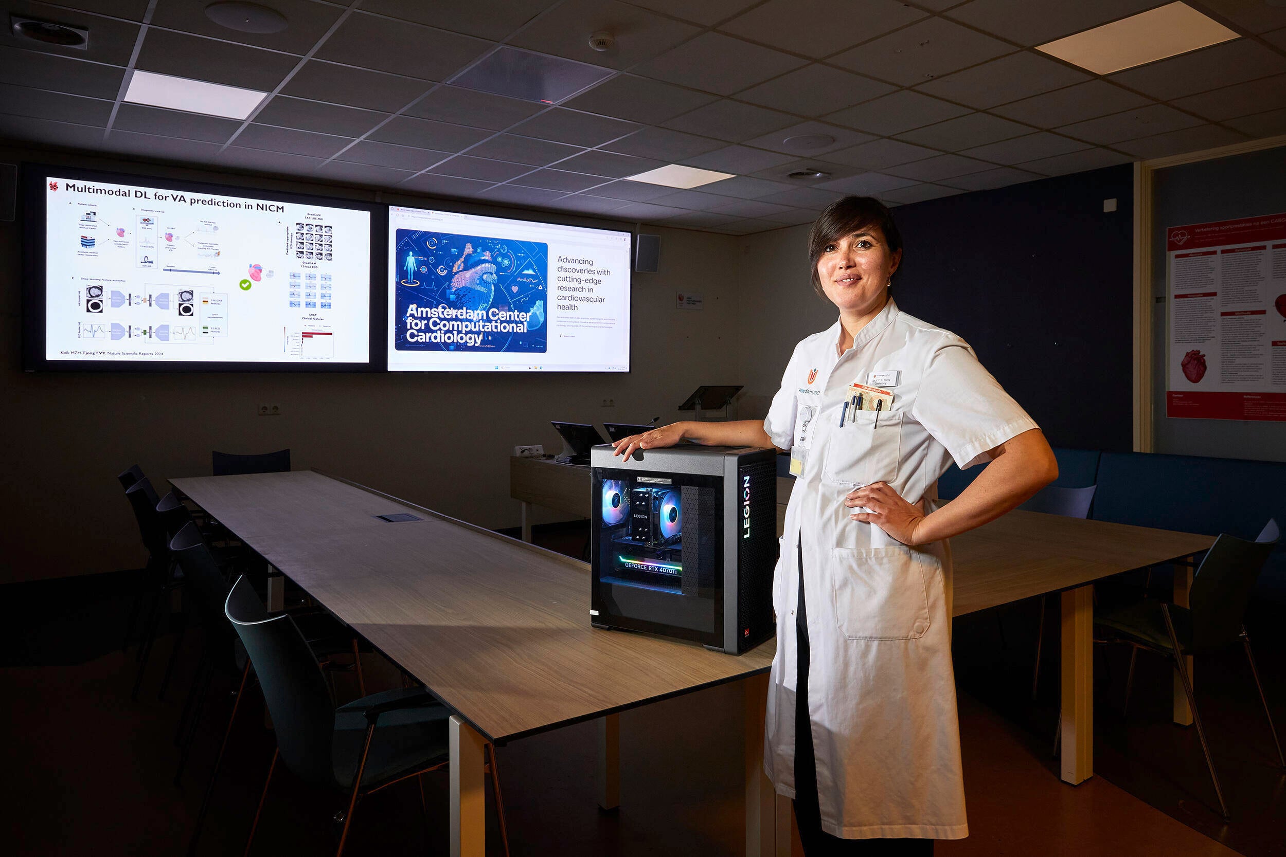 “Ik deed promotieonderzoek naar nieuwe therapieën voor het managen van hartritmestoornissen. Daarna, tijdens mijn opleiding tot cardioloog, bleef ik bij dat onderzoek betrokken. Een belangrijke vraag bij patiënten met ritmestoornissen is of iemand wel of niet een implanteerbare defibrillator nodig heeft. Zo’n ICD kan een plotse hartdood voorkomen, maar het implanteren brengt ook risico’s met zich mee, bijvoorbeeld het risico op een infectie. Je wilt dat dus niet onnodig doen. Om die afweging te maken kijken we nu vooral naar hoe goed het hart knijpt, maar dat is gebaseerd op onderzoek van tientallen jaren geleden. Toen AI opkwam zag ik de potentie ervan, onder meer voor het inschatten van risico’s van hartpatiënten. Ik ben programmeercursussen gaan volgen, heb een speciale AI-computer gekocht en ging voor een jaar naar de Stanford University in Californië. Daar waren ze al veel verder met het gebruik van AI. Nu houd ik me al ruim vijf jaar bezig met het ontwikkelen van AI-modellen, met name om hartritmestoornissen op te sporen en het risico op een plotse hartdood beter in te schatten.”