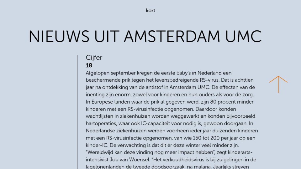 Afgelopen september kregen de eerste baby’s in Nederland een beschermende prik tegen het levensbedreigende RS-virus. Dat is achttien jaar na ontdekking van de antistof in Amsterdam UMC. De effecten van de inenting zijn enorm, zowel voor kinderen en hun ouders als voor de zorg. In Europese landen waar de prik al gegeven werd, zijn 80 procent minder kinderen met een RS-virusinfectie opgenomen. Daardoor konden wachtlijsten in ziekenhuizen worden weggewerkt en konden bijvoorbeeld hartoperaties, waar ook IC-capaciteit voor nodig is, gewoon doorgaan. In Nederlandse ziekenhuizen werden voorheen ieder jaar duizenden kinderen met een RS-virusinfectie opgenomen, van wie 150 tot 200 per jaar op een kinder-IC. De verwachting is dat dit er deze winter veel minder zijn. “Wereldwijd kan deze vinding nog meer impact hebben”, zegt kinderarts-intensivist Job van Woensel. “Het verkoudheidsvirus is bij zuigelingen in de lagelonenlanden de tweede doodsoorzaak, na malaria. Jaarlijks streven wereldwijd 100.000 kinderen aan RS-virusinfectie.”