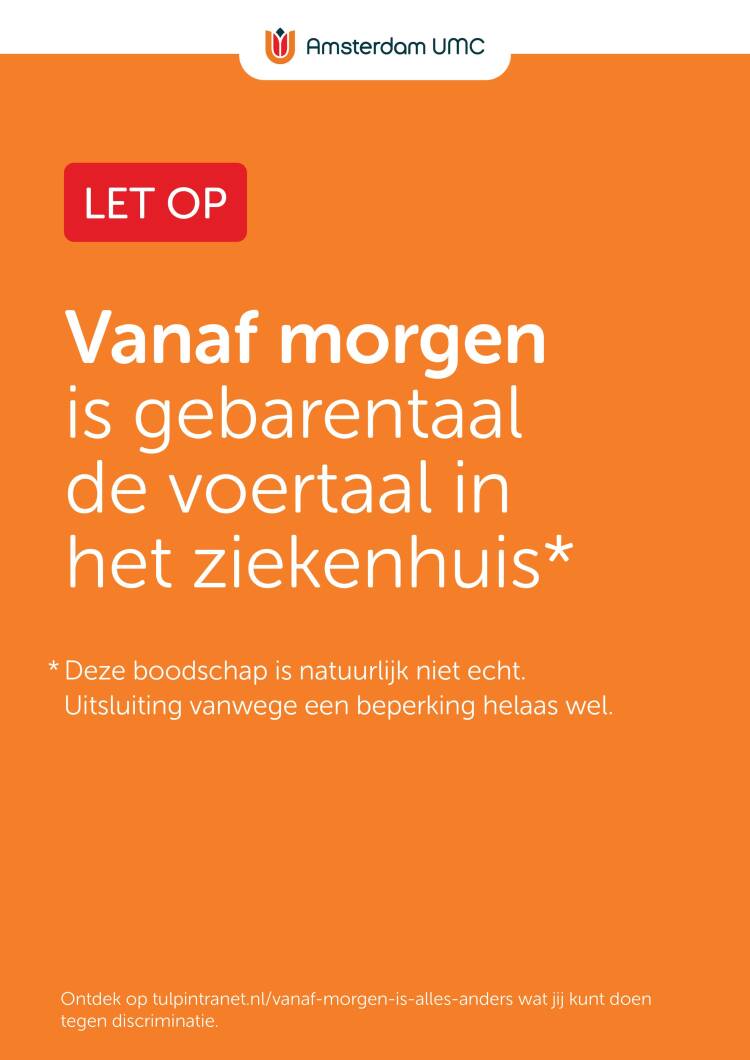 In oktober liep in Amsterdam UMC de campagne Vanaf morgen is alles anders. Met opvallende statements werden voorbijgangers bewustgemaakt van stereotypen en vaak onbewust ervaren privileges, en uitgenodigd om hierover in gesprek te gaan. De campagne kon op veel bijval rekenen, ook op sociale media.